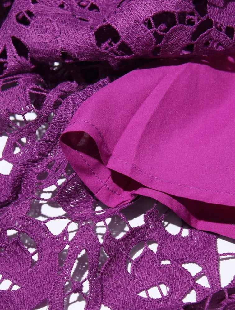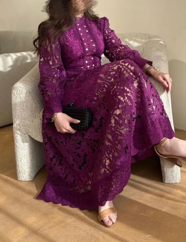 فستان نسائي فاخر مصنوع من الدانتيل المخرم باللون البنفسجي الجذاب، يتميز بتفاصيل دقيقة تضفي لمسة من الأناقة والأنوثة. الفستان ذو قصة طويلة مع أكمام طويلة وواسعة تضيف له طابعًا كلاسيكيًا وفاخرًا. يتميز بتصميم ياقة عالية وأزرار أمامية تضفي على الفستان مظهرًا عصريًا ورائعًا. هذا الفستان مثالي للمناسبات الرسمية مثل حفلات الزفاف والمناسبات الخاصة.